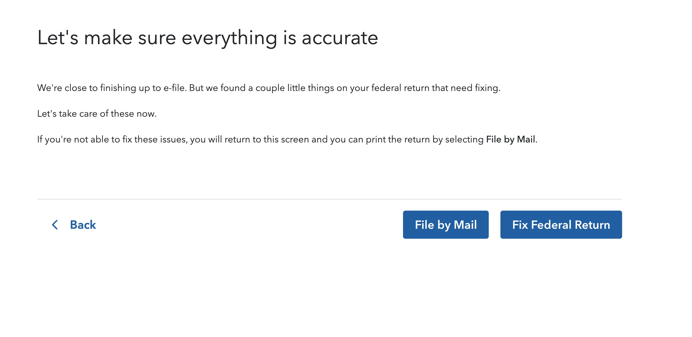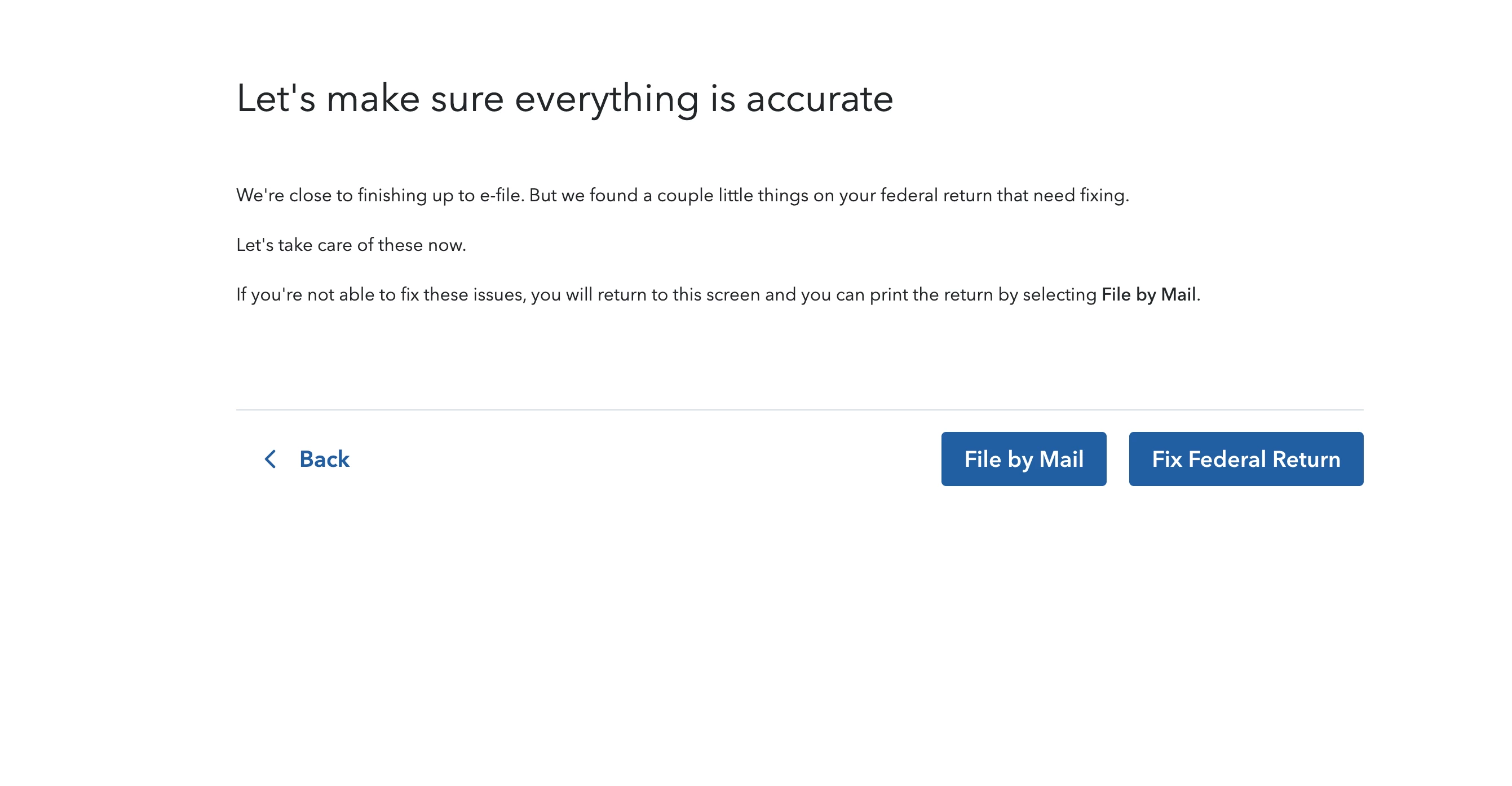 "Let's make sure everything is accurate. We're close to finishing up to e-file. But we found a couple little things on your federal return that need fixing. Let's take care of these now. If you're not able to fix these issues, you will return to this screen and you can print the return by selecting File by Mail."