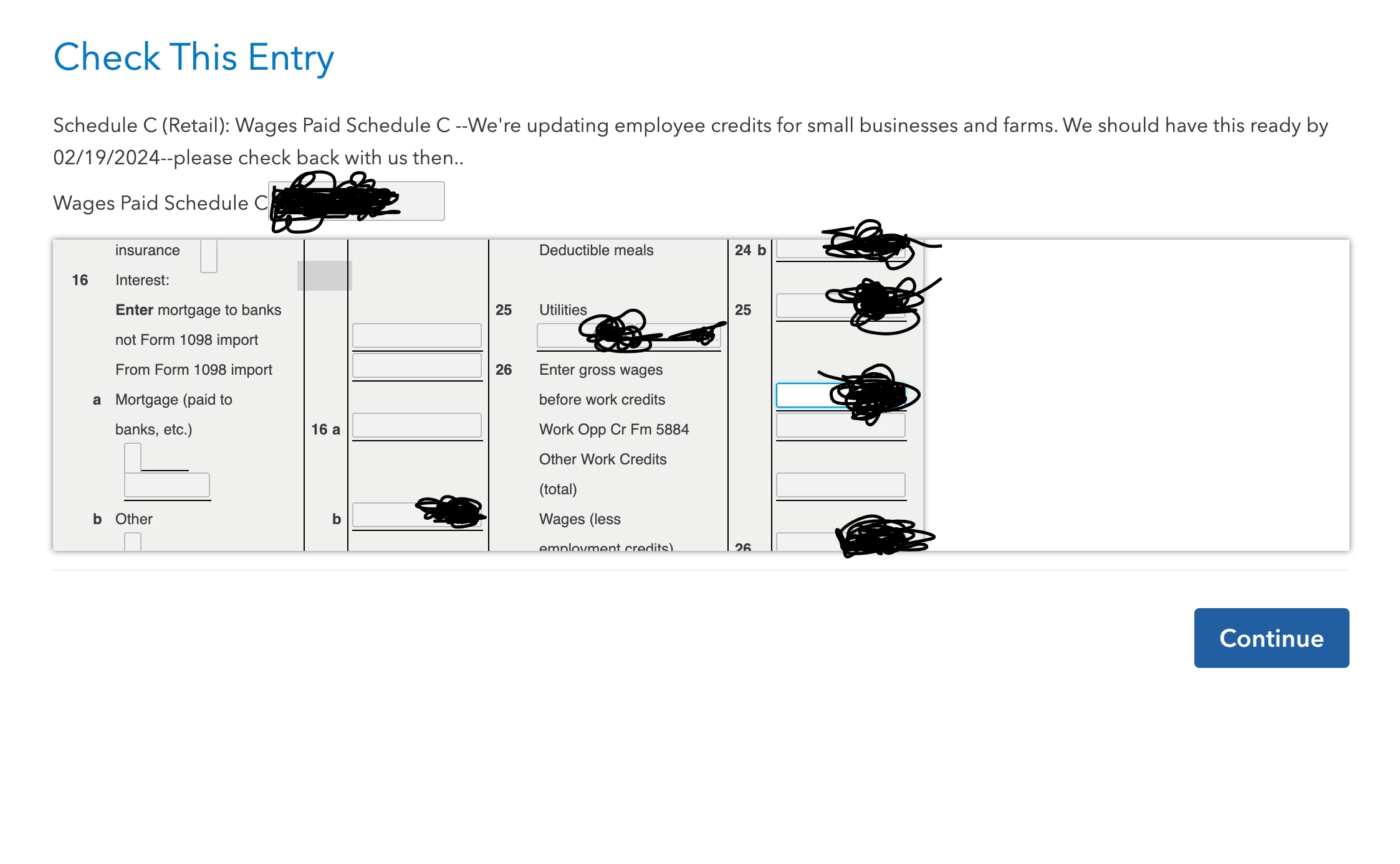 "Schedule C (Retail): Wages Paid Schedule C -We're updating employee credits for small businesses and farms. We should have this ready by 02/19/2024-please check back with us then..