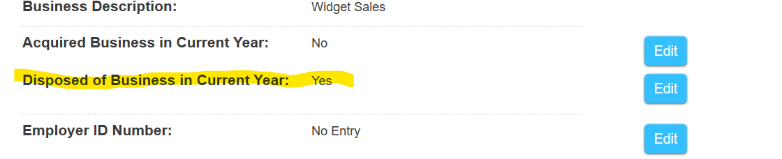 Then, on the next screen edit the Disposed of Business in Current Year option to read "yes"