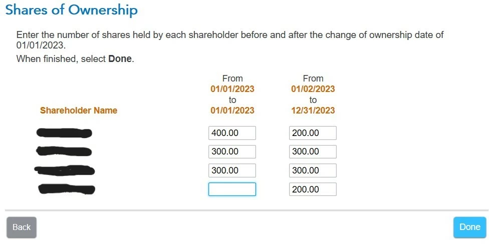 Using Turbotax for Business, I have a S-corp ownership percentage change effective for January 1, 2023.  The software interprets this as effective 11:59pm on the change date, so it calculates the percentages for 1/1/23 through 1/1/23, and then 1/2/23 through 12/31/23 (which does have a very small percentage variance).  Changing the effective date to 12/31/22 causes an error in the audit check because the effective date is for a prior tax period.