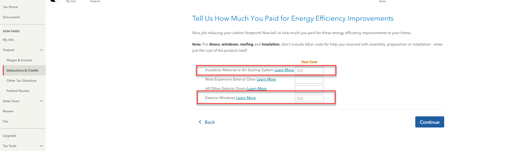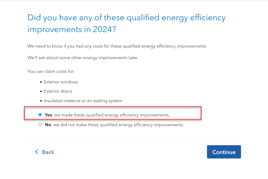 5. Answer the next few questions until you get to Did you have any of these qualified energy efficiency improvements in 2024?  Both windows and insulation material or air sealing system are listed here.  Select Yes and continue.