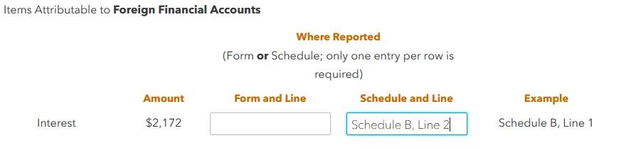 I was able to fill my foreign accounts and interest. Also fill the page 'where reported' where I indicate the amount the form, schedule and line. But nothing appears on the scheduleB