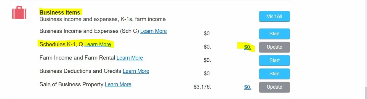 3. I've included a screen shot to assist with my previous #5 question that was a little confusing.  I'm just trying to indicate that after I entered all of the K-1 information, the Schedules K-1 line item in the Business Items section of the Wages and Income root section still shows a $0 value.  I'd expect that number to change, as the taxes due did increase once I included that capital gain in that section.