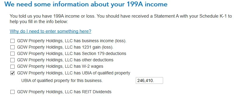 It is possible that additional information, such as the UBIA that you mentioned, may need to be entered.  Click the box to the left to open up entry boxes.