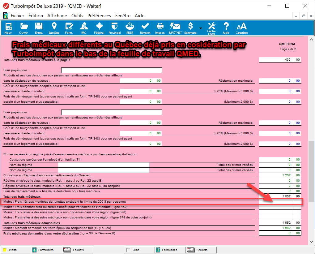Avec la version CD/Téléchargement de TurboImpôt vous devez entré le montant à soustraire au Québec (si ce montant est de 250$ par exemple, vous devez soustraire 50$ au frais médicaux pour le calcul au Québec) dans le bas de la feuille de calcule QMED, voir la capture d'écran ci-dessous.